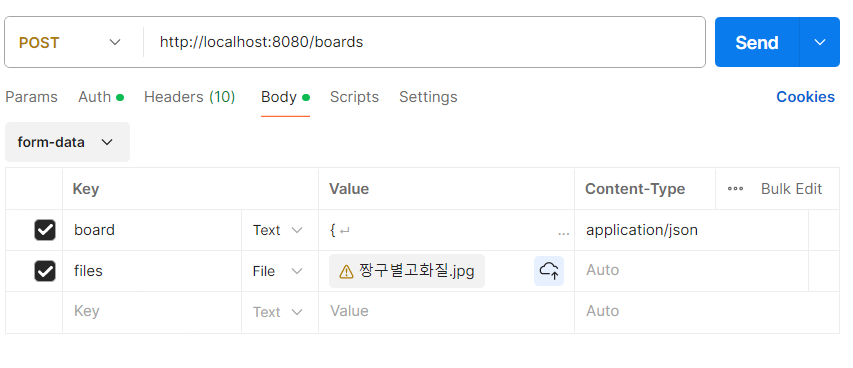 여기서 Text 형태 데이터의 Content-Type에 application/json을 반드시 작성해야 합니다!